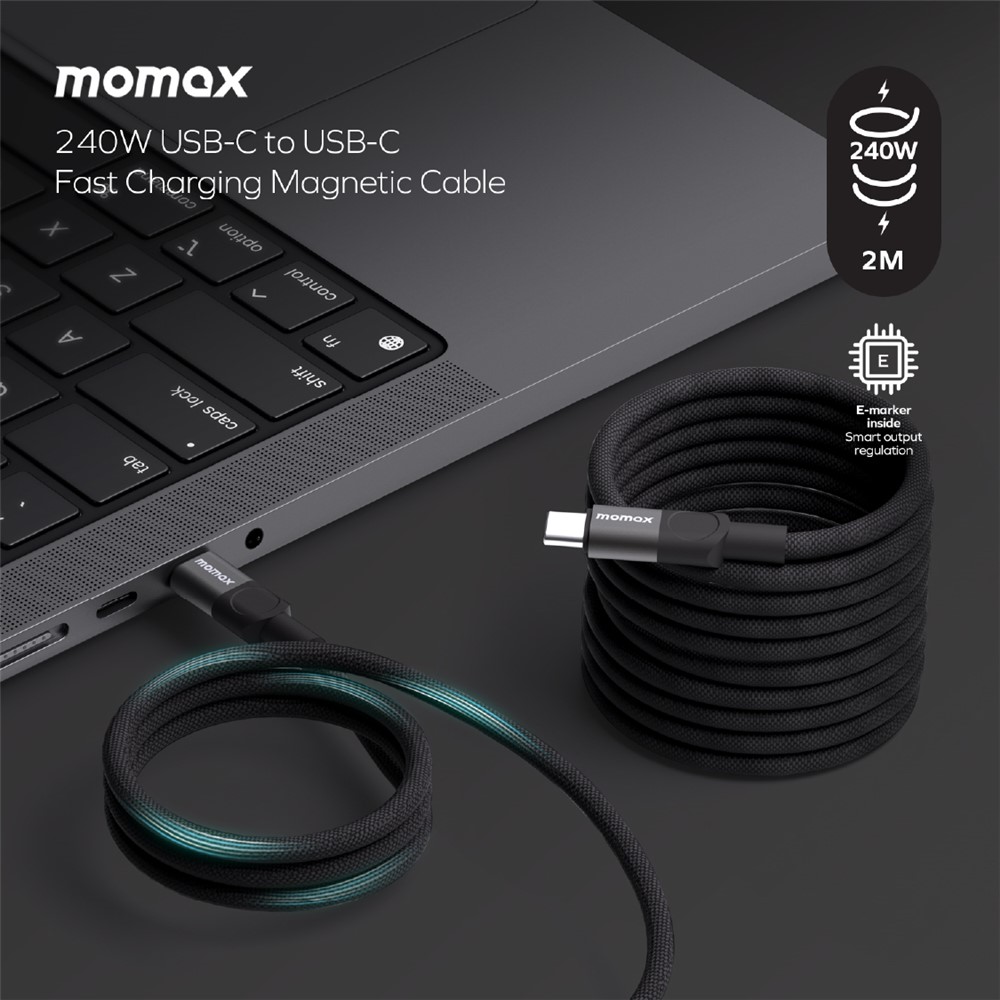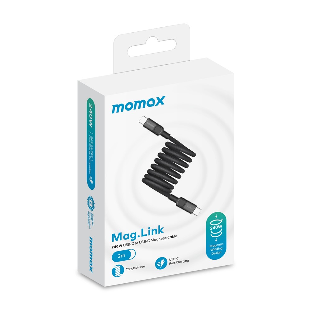Momax Mag.Link USB-C-kabel kombinerar hög prestanda med praktisk användarvänlighet. Den magnetiska funktionen gör det enkelt att linda ihop kabeln efter användning, och den kraftiga nylonflätningen skyddar mot slitage.